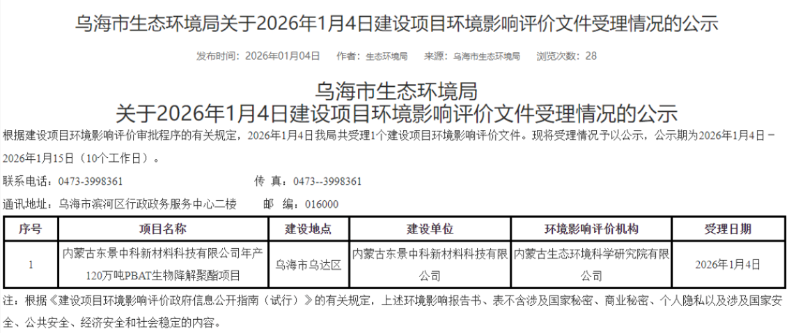 2025年1月4日,乌海市生态环境局发布关于2026年1月4日建设项目环境影响评价文件受理情况的公示,其中包括内蒙古东景中科新材料科技有限公司年产120万吨PBAT生物降解聚酯项目。