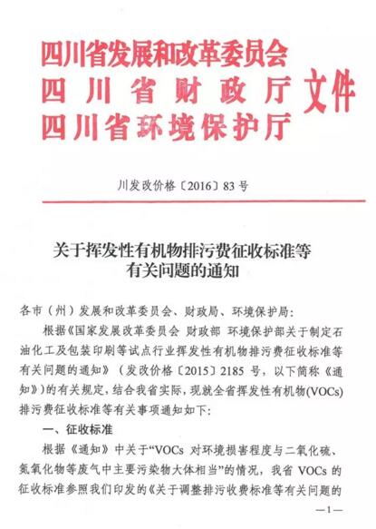 《四川省发展和改革委员会 四川省财政厅四川省环境保护厅关于挥发性有机物排污费征收标准等有关问题的通知》(川发改价格〔2016〕83号)