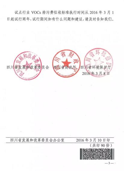 近日,继北京市、上海市、江苏省、安徽省和湖南省开征挥发性有机物VOCs排污费之后,四川省成为全国第六个省份、正式发布文件通知试点开征VOCs排污费,从2016年3月1日起执行。