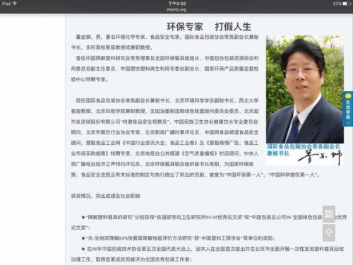 记者晚上在网上查询到国际食品包装协会官方网站,发现网站还能打开。在协会领导介绍一栏中,董金狮排在第二位,在“环保专家 打假人生”标题下是对董金狮的介绍。记者发现,董金狮的社会头衔竟有50个:著名环境化学专家、食品安全专家,国际食品包装协会常务副会长兼秘书长,多所高校客座教授或兼职教授??