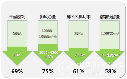 环葆嘉节能相关负责人表示,ESO节能减排系统在保证生产安全的前提下,从源头上智能化地解决企业生产设备能耗高,废气排放风量大、浓度低的问题,并增加了除味降耗、隔音隔热等实用功能。ESO系统的突出特点是可以取代现在流行的凹版印刷机/干式复合机的热风干燥系统,不仅满足原有的干燥需求,还能大幅度节约印刷机和复合机烘干箱能耗,进而实现基本免费供热。还可以通过科学合理的循环设计降低排风量、提高排放浓度,通过对输出的热能与节能后的供热进行良好的匹配,大幅度减少后续VOCs治理焚烧设施的投入。可以说,一套ESO节能减排系统可同时替代热泵和浓缩转轮,既实现了大幅度节能又为大幅度减少VOCs治理投入创造了条件,一举两得。上海灵博安装的ESO节能减排系统的持续运行已显示这两个突出的特点和卓越的功效。连续检测的数据令人满意:8色凹版印刷机的干燥能耗从原来的260A减少到80A,排风总量减少到3000~4500m3/h,排风VOCs浓度增加到1500ppm以上,溶剂残留多家机构检测结果均完全达标。
