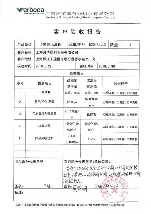 近日,致力创新VOCs治理技术的广东环葆嘉节能科技有限公司为华东知名包装印刷企业上海灵博塑料包装有限公司打造的ESO节能减排系统正式通过验收,在上海灵博8色凹版印刷机安装的首台ESO节能减排系统运行效果令人惊喜,核心指标超出预期,多项增值功能令人耳目一新,对此,上海灵博总经理周发明给予了充分肯定,表示ESO节能减排系统是一项重大技术创新,为软包装企业实现低成本高效率治理VOCs提供了新利器。