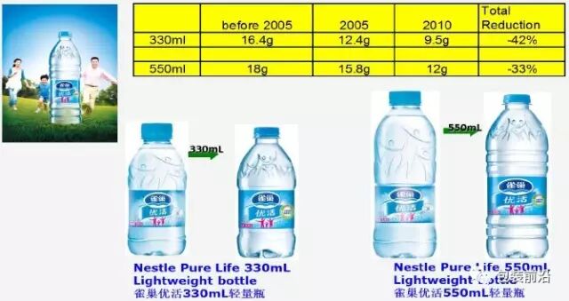 雀巢应用的一个成功的案例就是矿泉水瓶上的减重。通过设计,矿泉水瓶不仅减少了重量而强度并没有显著下降,仍然有足够的支撑强度。经过几轮优化设计,矿泉水瓶的重量减轻程度达到30%~45%,如果按吨数来算,则是千吨级以上的减少,这对于减轻环境压力是非常明显的贡献。