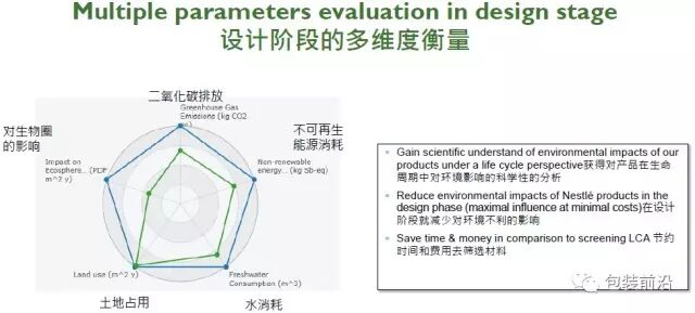 其次,雀巢会对产品包装进行多维度评估,评估指标不是唯一的,需要综合考虑包装材料对水的消耗、土地的占用、二氧化碳的排放以及对生物圈的影响,尤其是对不可再生能源的消耗等。