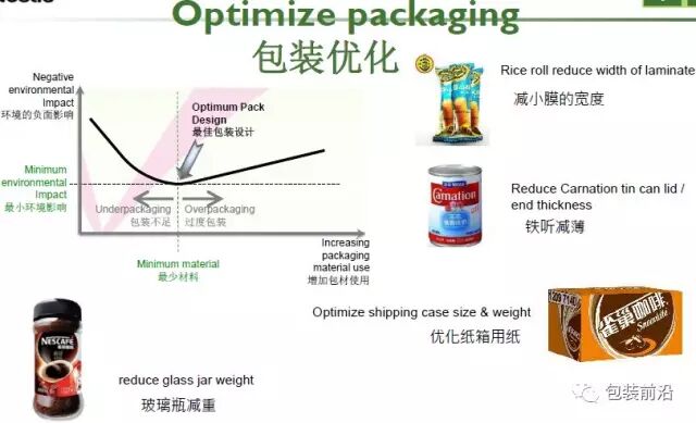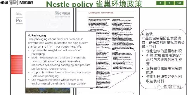雀巢是目前全球最大的食品公司,有超过一万种产品,有各种各样的包装形式和包装材料。雀巢认为自己对环境承担着更重的责任,并且一直注重包装不过度,尽量减少包装对环境的影响,尽量重复使用或者环保使用。雀巢的政策就是优化整个包装的重量和体积,应用再生包装资源,或者回收包装里含有的能源,尽量用对环境影响较小的材料。